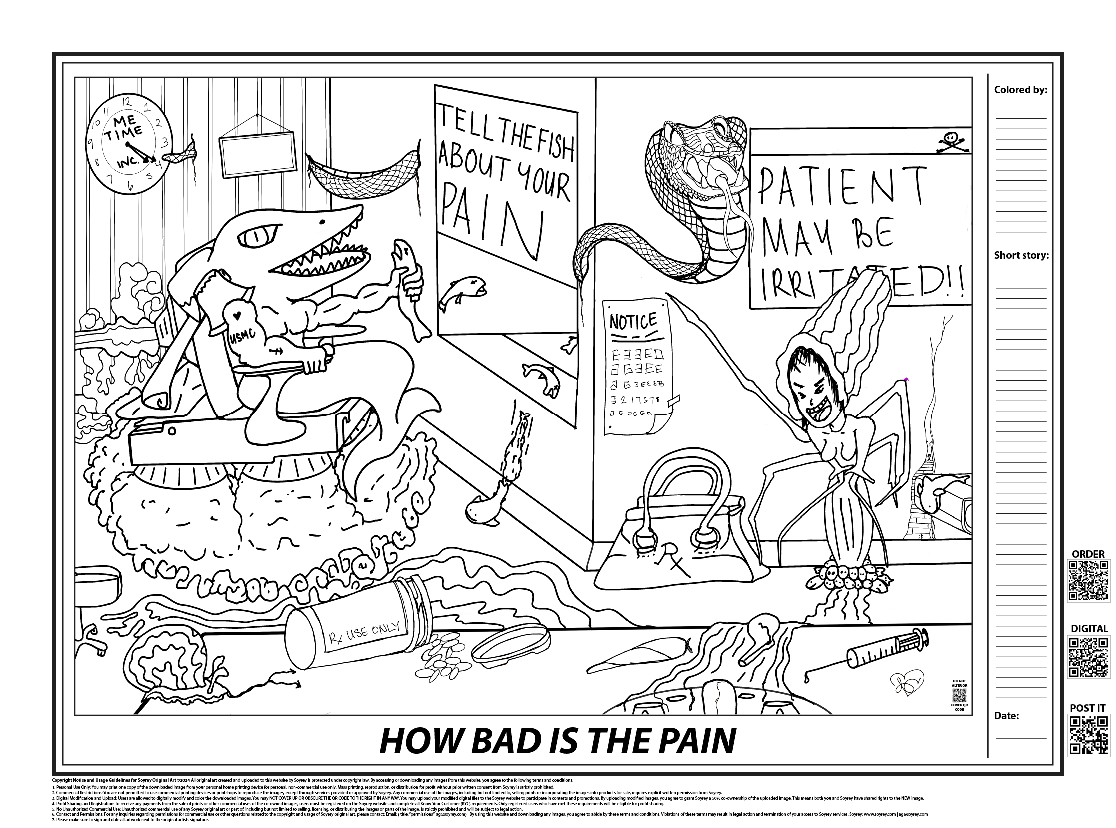 In my latest illustration, “How Bad Is the Pain?”, I explore the often daunting experience of visiting the doctor’s office. This piece captures the moment when you’re asked that crucial question, and the myriad of emotions that accompany it. DOWNLOAD THE FREE FILE HERE.