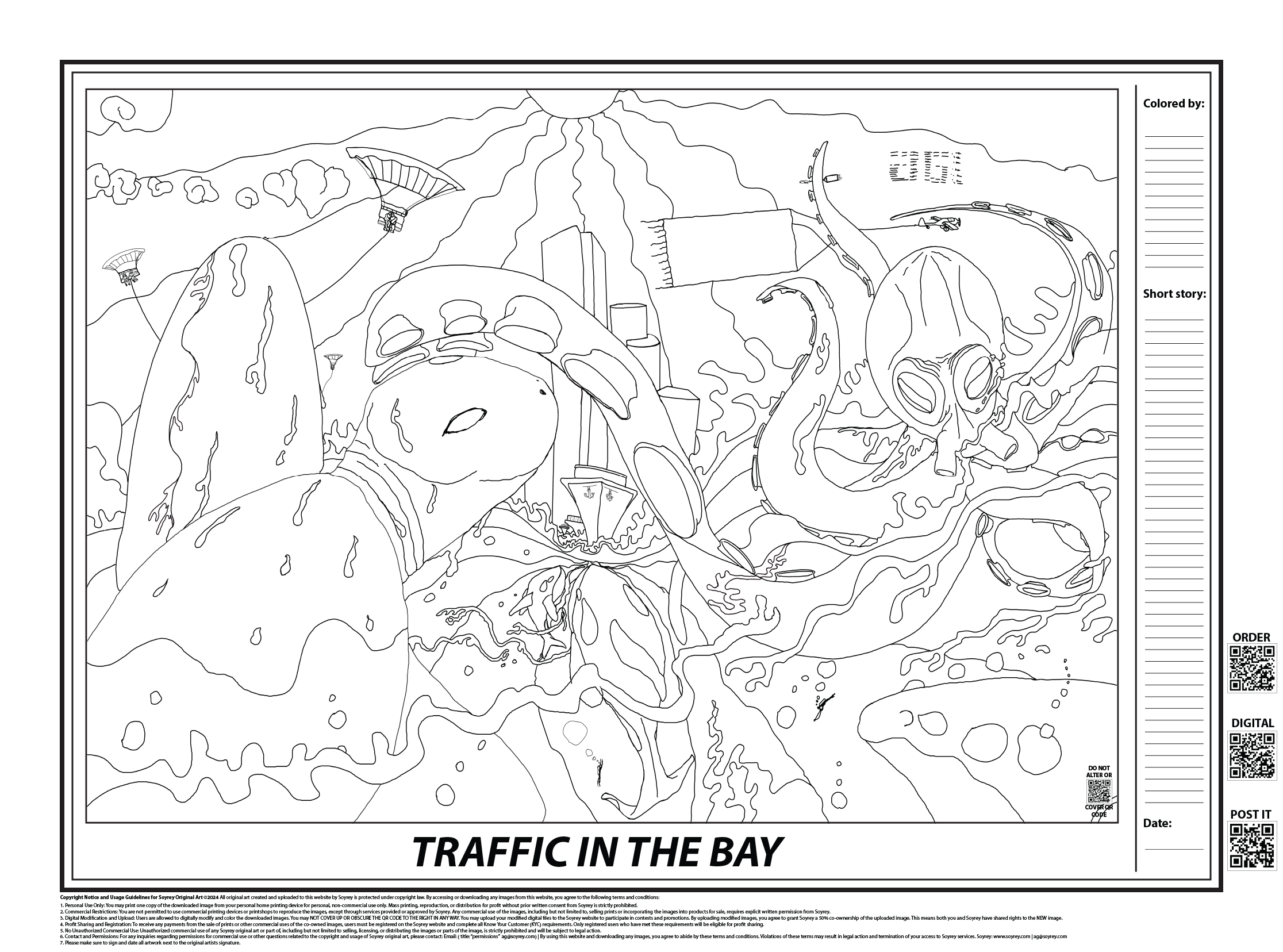 This illustration, “Traffic in the BAY”, was inspired after a visit to the Santa Ana Grand Central Art Center (GCAC)-A multi sensory piece by the artist Julia Edith Rigby. Her piece in combination with documentaries from the Nature Channel, and National Geographic channel inspired this piece. Memories of countries dredging up sand along the coastline to make artificial islands in shapes of palm trees, world map and other items. DOWNLOAD THE FREE FILE HERE.